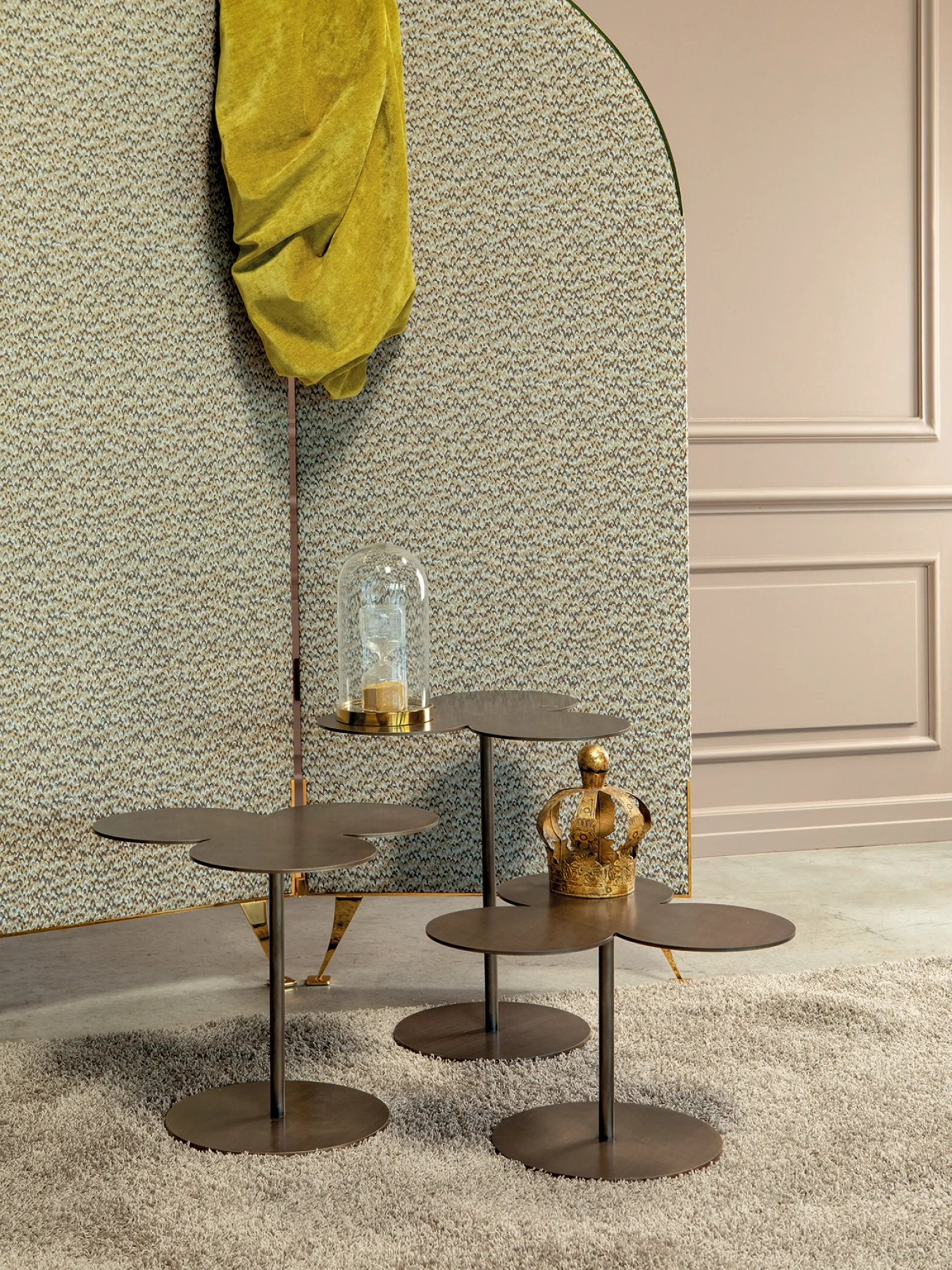 Molto versatili e plurifunzionali, i Complementi design in metallo rispondono a funzioni differenti: ultimano le doti di praticità e l'estetica dell'ambiente. Complementi e tavolini personalizzano l'arredo di casa, occupando lo spazio in maniera utile e rendendolo accogliente e bello a vedersi. Le composizioni di grande fascino del marchio Tonin Casa arredano l'habitat con colore e stile, ricreando peculiari atmosfere arredative. Tavolino Ryazka con top a forma di trifoglio di Tonin Casa in metallo: aggiungerà carattere e charme a un interno arredato con mobili ed elementi accessori dai richiami design.
