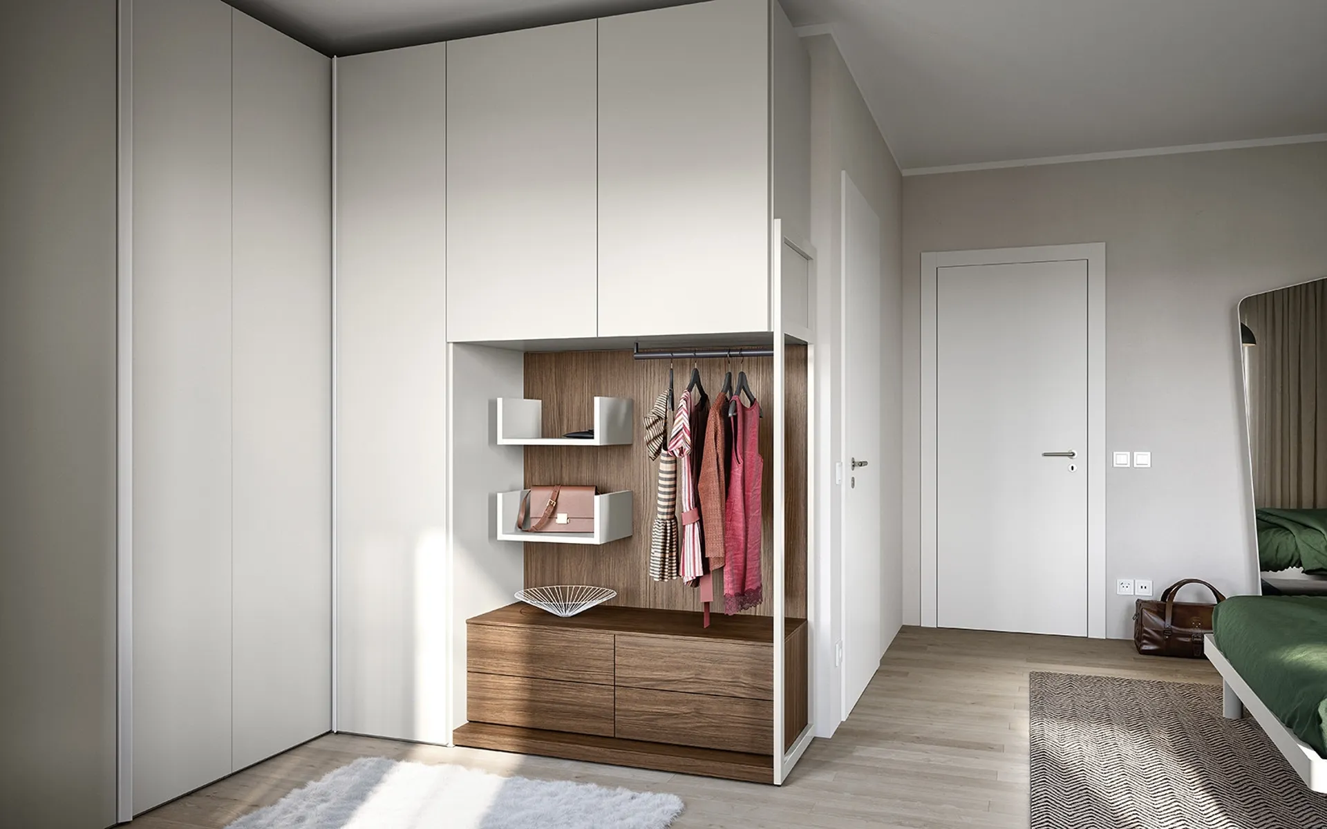 Contattaci e ottieni informazioni sulla nostra collezione di Arredamento Casa: avrai la possibilità di completare la zona del riposo avendo a disposizione una diversificata disponibilità di contenitori moderni, come l'armadio in melaminico nell'immagine. Per progettare alla perfezione una stanza bella e funzionale, opta per le più originali soluzioni dei migliori brand, letti, armadi e comodini di alto contenuto estetico. Armadio angolare con anta battente 09A di Cinquanta3: compila il form per ricevere informazioni di ogni tipo e consigli per progettare la camera che hai sempre desiderato.