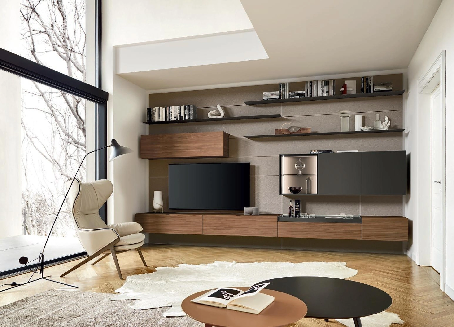 Anche in un living di dimensioni contenute, questo tipo di arredo riesce a organizzare al meglio gli spazi sfruttando bene ogni angolo e assicurando l'alta componibilità tipica delle soluzioni moderne. La Parete Attrezzata Lampo 186 di Sangiacomo nella fotografia, realizzata in legno, risolve le più particolari problematiche abitative di stile e spazio senza rinunciare alla ricerca stilistica. Questa proposta costituisce tutta l'eccellenza che il brand garantisce grazie a pluriennale competenza e grande passione nel campo dell'arredo e del design. Un po’ librerie, un po’ mobili contenitori ed espositori: le Pareti Attrezzate sono ideali per attrezzare uno spazio dinamico e operativo.